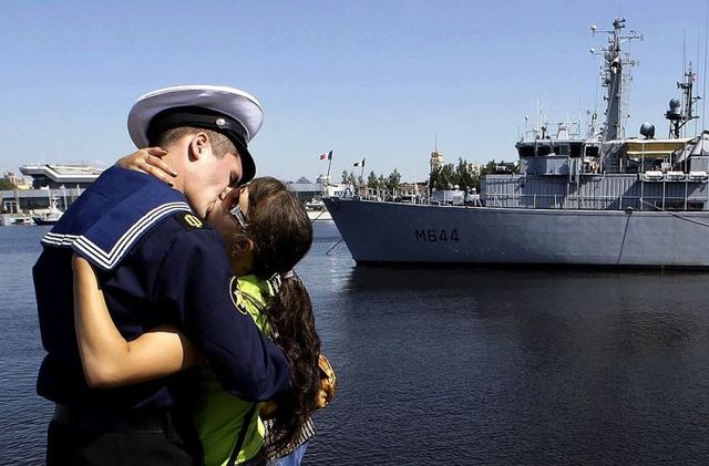 A couple kiss in front of a Russian military ship during the International Maritime Defence Show in St. Petersburg Jan 14, 2017 | Uncategorized | 0 comments